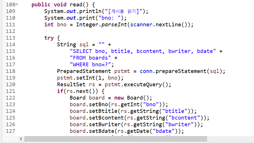 즉, "SELECT bno, btitle, bcontent, bwriter, bdate " + "FROM boards " 이렇게 되어야 한다는 것이다.